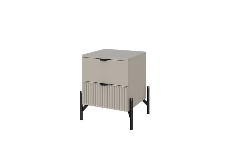 Прикроватная тумба «Нео» выполнена в современном минималистичном стиле с акцентом на строгую геометрию и выразительные детали. Декоративная рифлёная фасадная панель и изящные металлические опоры придают модели визуальную лёгкость и делают её актуальным элементом интерьера.